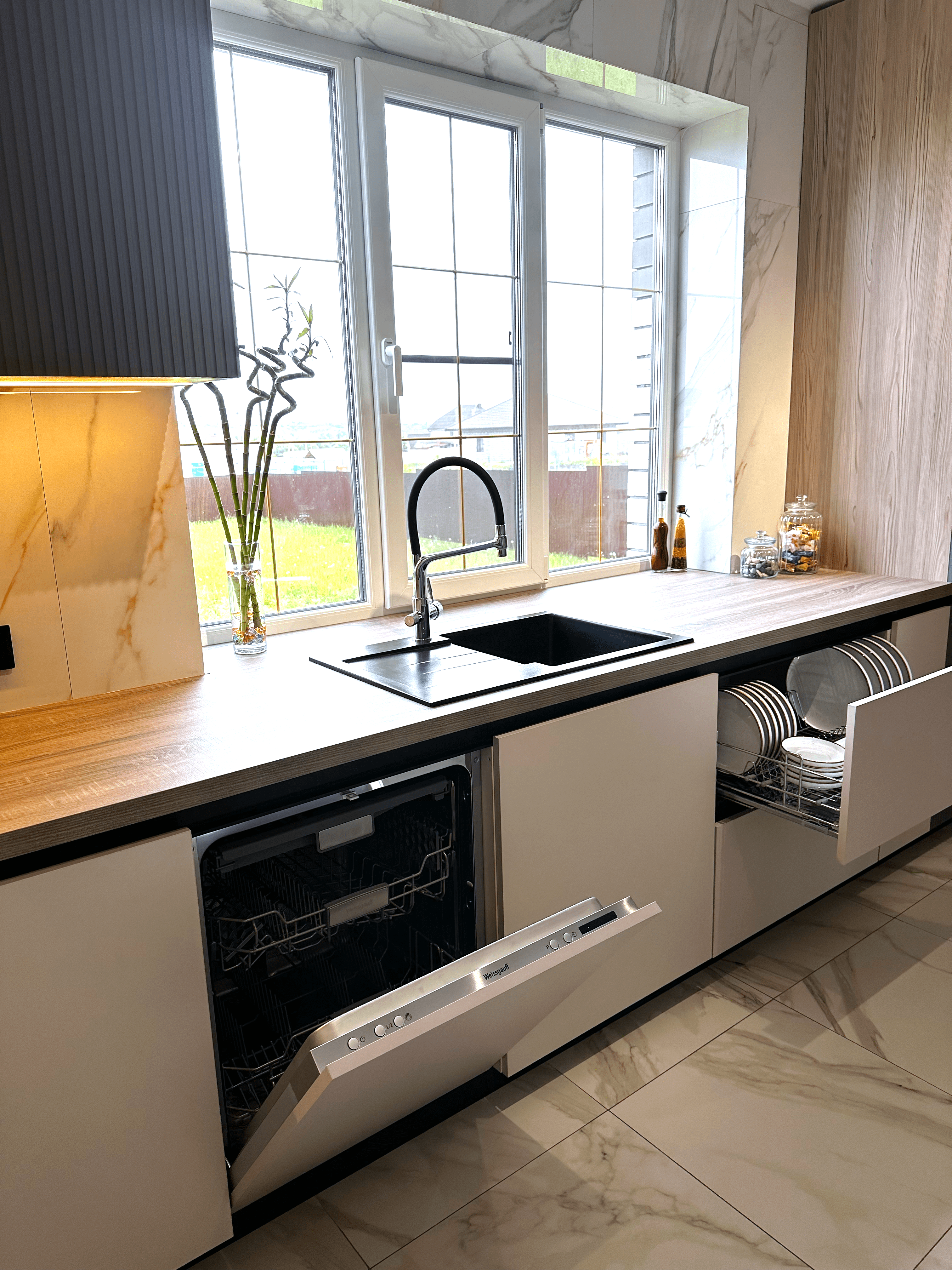 Благодаря высокоточному оборудованию, наше производство делает кухни, точно соответствующие 3D проекту и дает гарантию на кухню и все работы до 3 лет, а на фурнитуру до 30 лет.